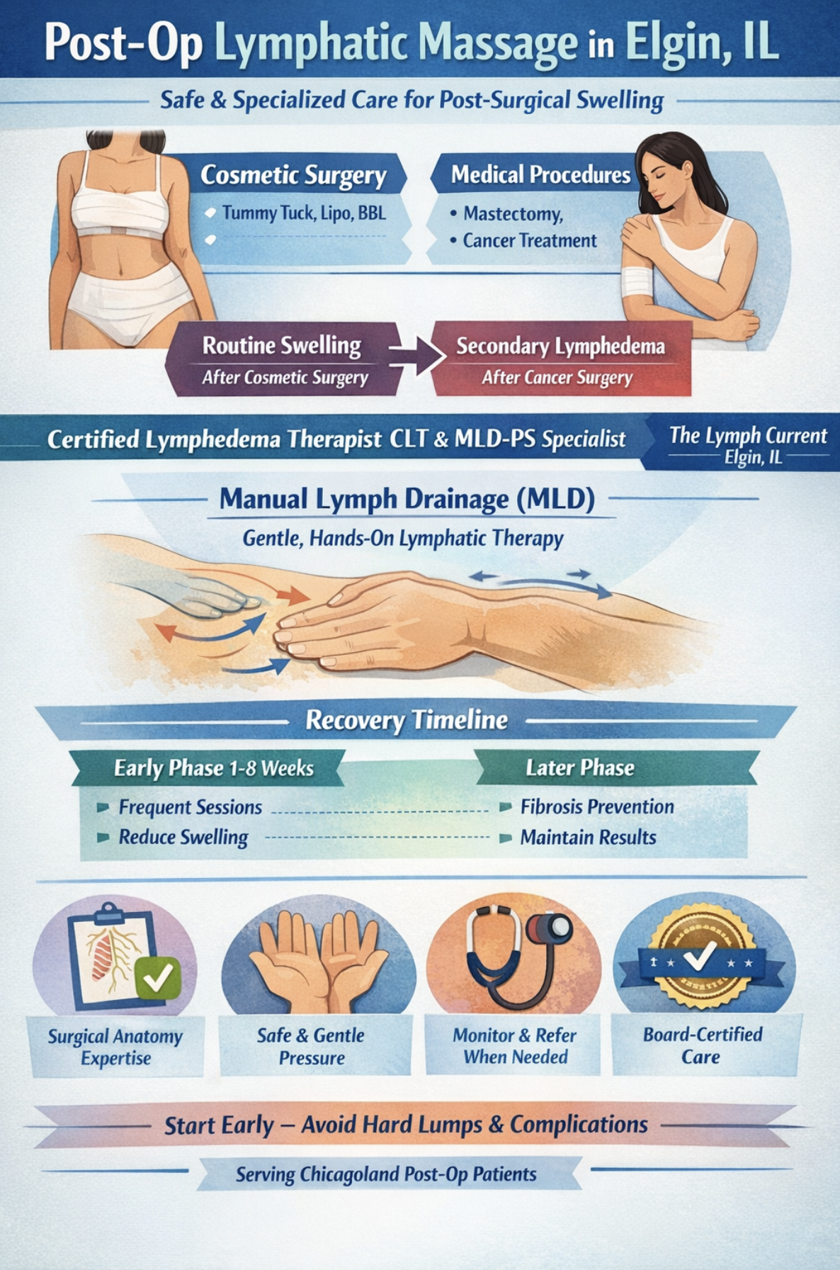 Post-op is a time for you to relax and focus on healing. The Lymph Current is here to assist you in your lymphatic drainage. If you’re in Chicago and searching for post-op lymphatic drainage near you, The Lymph Current in Elgin serves Chicagoland clients seeking CLT-led, surgeon-cleared, clinically informed post-surgical MLD